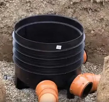 - Дренажные колодцы. Предназначены для сбора и вывода воды с участка, к стенкам подсоединены трубы. Могут использоваться для септиков, ливневой канализации или как смотровые.