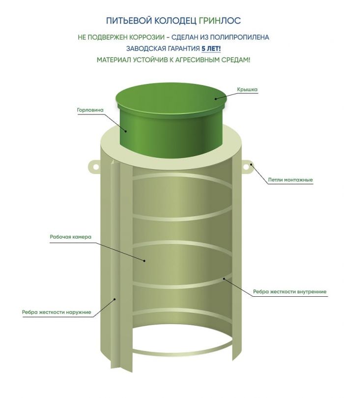 Питьевой колодец ГРИНЛОС П 750/1000 забирает воду из водоносного слоя, очищает ее через донный фильтр от примесей и загрязнений. Установив насос воду, можно пустить в дом или в накопительный бак, подключить водопроводный кран и шланги бытовых приборов.